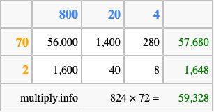 Finally, we add up all the sums we found in step 3 to get our final answer to 824 times 72.