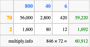 Below is an illustration showing you how to calculate 846 times 72 using the box method, using the instructions above.