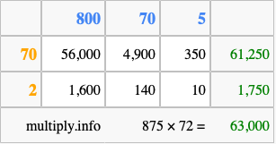 Finally, we add up all the sums we found in step 3 to get our final answer to 875 times 72.