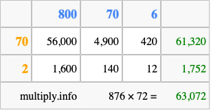 Finally, we add up all the sums we found in step 3 to get our final answer to 876 times 72.