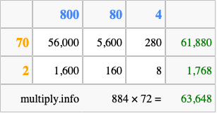 Finally, we add up all the sums we found in step 3 to get our final answer to 884 times 72.