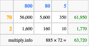 Finally, we add up all the sums we found in step 3 to get our final answer to 885 times 72.
