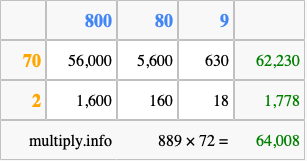 That's all there is to it! As you can see from the box above, the answer to 889 times 72 using the box method is 64,008.