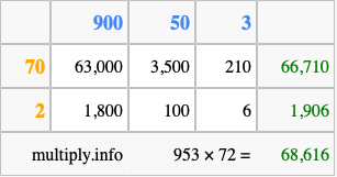 That's all there is to it! As you can see from the box above, the answer to 953 times 72 using the box method is 68,616.