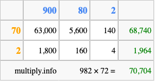 That's all there is to it! As you can see from the box above, the answer to 982 times 72 using the box method is 70,704.