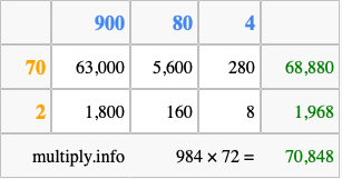 That's all there is to it! As you can see from the box above, the answer to 984 times 72 using the box method is 70,848.