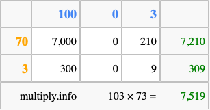 Below is an illustration showing you how to calculate 103 times 73 using the box method, using the instructions above.