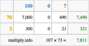Below is an illustration showing you how to calculate 107 times 73 using the box method, using the instructions above.