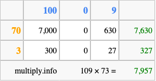 Below is an illustration showing you how to calculate 109 times 73 using the box method, using the instructions above.