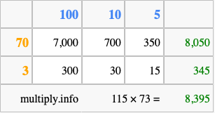 That's all there is to it! As you can see from the box above, the answer to 115 times 73 using the box method is 8,395.