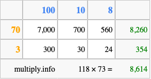 Below is an illustration showing you how to calculate 118 times 73 using the box method, using the instructions above.