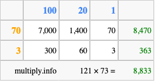 That's all there is to it! As you can see from the box above, the answer to 121 times 73 using the box method is 8,833.