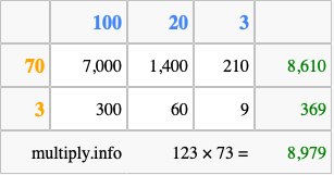 Finally, we add up all the sums we found in step 3 to get our final answer to 123 times 73.
