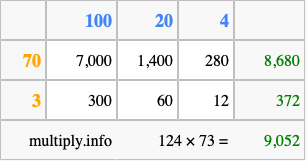 Below is an illustration showing you how to calculate 124 times 73 using the box method, using the instructions above.