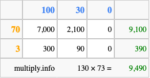 Finally, we add up all the sums we found in step 3 to get our final answer to 130 times 73.