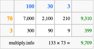 Below is an illustration showing you how to calculate 133 times 73 using the box method, using the instructions above.