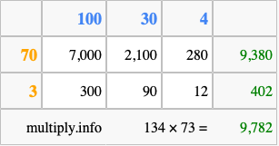 Below is an illustration showing you how to calculate 134 times 73 using the box method, using the instructions above.