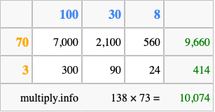 Finally, we add up all the sums we found in step 3 to get our final answer to 138 times 73.