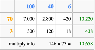 Finally, we add up all the sums we found in step 3 to get our final answer to 146 times 73.