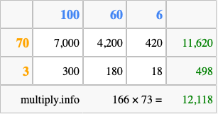 Finally, we add up all the sums we found in step 3 to get our final answer to 166 times 73.