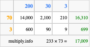 Below is an illustration showing you how to calculate 233 times 73 using the box method, using the instructions above.