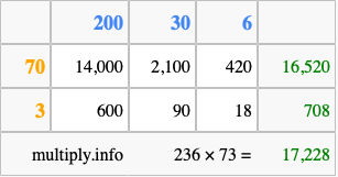 Finally, we add up all the sums we found in step 3 to get our final answer to 236 times 73.