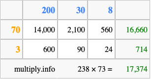 Finally, we add up all the sums we found in step 3 to get our final answer to 238 times 73.