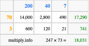 Finally, we add up all the sums we found in step 3 to get our final answer to 247 times 73.