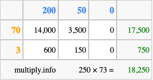 Below is an illustration showing you how to calculate 250 times 73 using the box method, using the instructions above.
