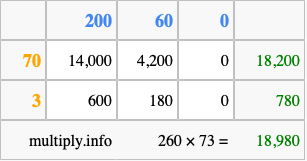 That's all there is to it! As you can see from the box above, the answer to 260 times 73 using the box method is 18,980.