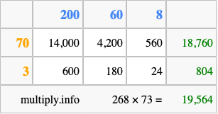 That's all there is to it! As you can see from the box above, the answer to 268 times 73 using the box method is 19,564.
