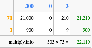 That's all there is to it! As you can see from the box above, the answer to 303 times 73 using the box method is 22,119.