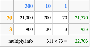 Finally, we add up all the sums we found in step 3 to get our final answer to 311 times 73.