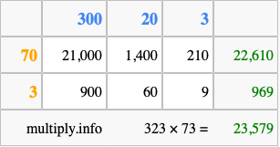 That's all there is to it! As you can see from the box above, the answer to 323 times 73 using the box method is 23,579.