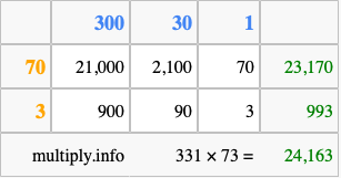That's all there is to it! As you can see from the box above, the answer to 331 times 73 using the box method is 24,163.