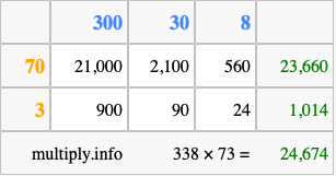 That's all there is to it! As you can see from the box above, the answer to 338 times 73 using the box method is 24,674.