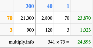 That's all there is to it! As you can see from the box above, the answer to 341 times 73 using the box method is 24,893.