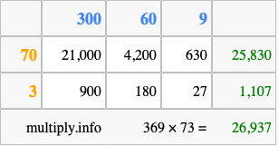 Finally, we add up all the sums we found in step 3 to get our final answer to 369 times 73.
