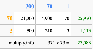 Below is an illustration showing you how to calculate 371 times 73 using the box method, using the instructions above.