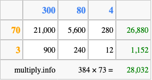 That's all there is to it! As you can see from the box above, the answer to 384 times 73 using the box method is 28,032.