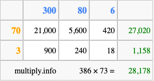 Finally, we add up all the sums we found in step 3 to get our final answer to 386 times 73.