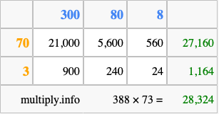 Finally, we add up all the sums we found in step 3 to get our final answer to 388 times 73.