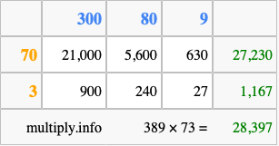 Finally, we add up all the sums we found in step 3 to get our final answer to 389 times 73.