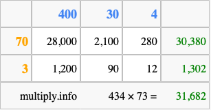 Finally, we add up all the sums we found in step 3 to get our final answer to 434 times 73.