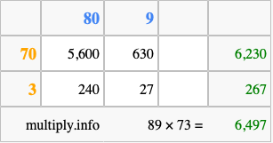 Finally, we add up all the sums we found in step 3 to get our final answer to 89 times 73.