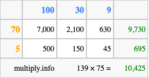 Below is an illustration showing you how to calculate 139 times 75 using the box method, using the instructions above.