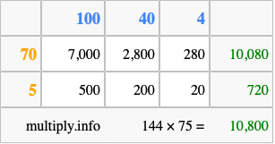 Finally, we add up all the sums we found in step 3 to get our final answer to 144 times 75.