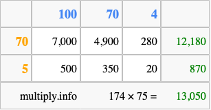 Below is an illustration showing you how to calculate 174 times 75 using the box method, using the instructions above.