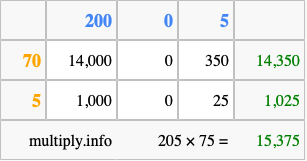 Finally, we add up all the sums we found in step 3 to get our final answer to 205 times 75.