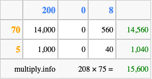 Finally, we add up all the sums we found in step 3 to get our final answer to 208 times 75.